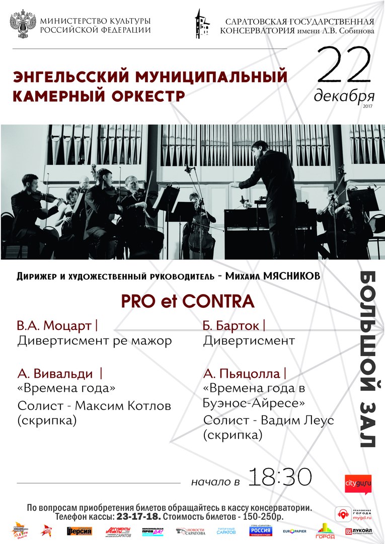 22 декабря 2017 года в 18.30 часов в Большом зале Саратовской консерватории концерт Энгельсского камерного оркестра.