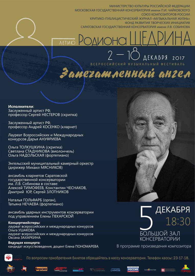 Проект, посвященный 85-летию композитора Родиона Щедрина, стартовал 2 декабря сразу в нескольких городах России. Кроме Саратова, череда концертов проходит в Санкт-Петербурге, Владивостоке, Боровске, Калуге, Красноярске, Нижнем Новгороде, Оренбурге, Сургуте, Туле, Улан-Удэ, а закрытие фестиваля состоится 18 декабря в Москве. | |